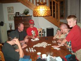 Graham heeft gezorgd voor lasagna; lekker gemakkelijk om even zo aan te kunnen schuiven. Na het eten natuurlijk vuurtje stoken. Wij hebben de domino voor de draad gehaald en Eric en Graham het spel even uitgelegd, waarna er heel fanatiek werd gespeeld tot in de late uurtjes.